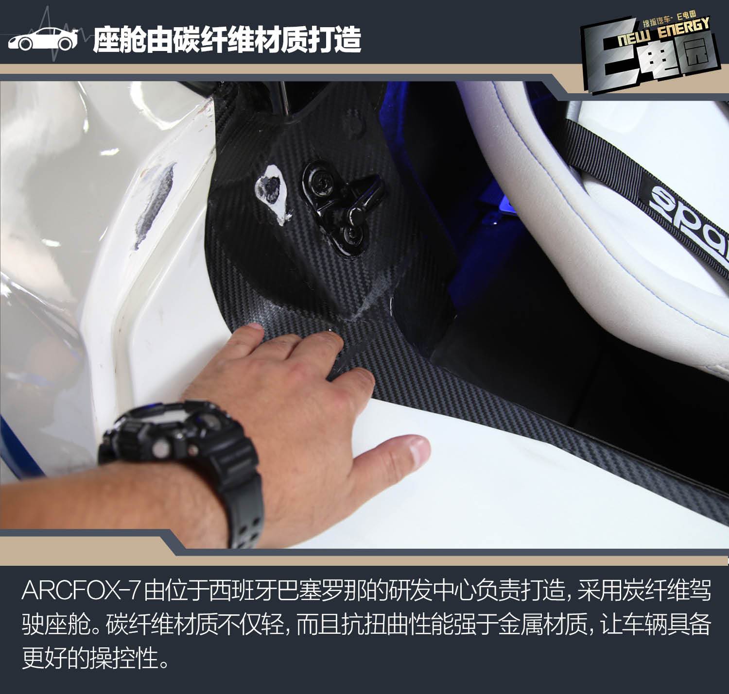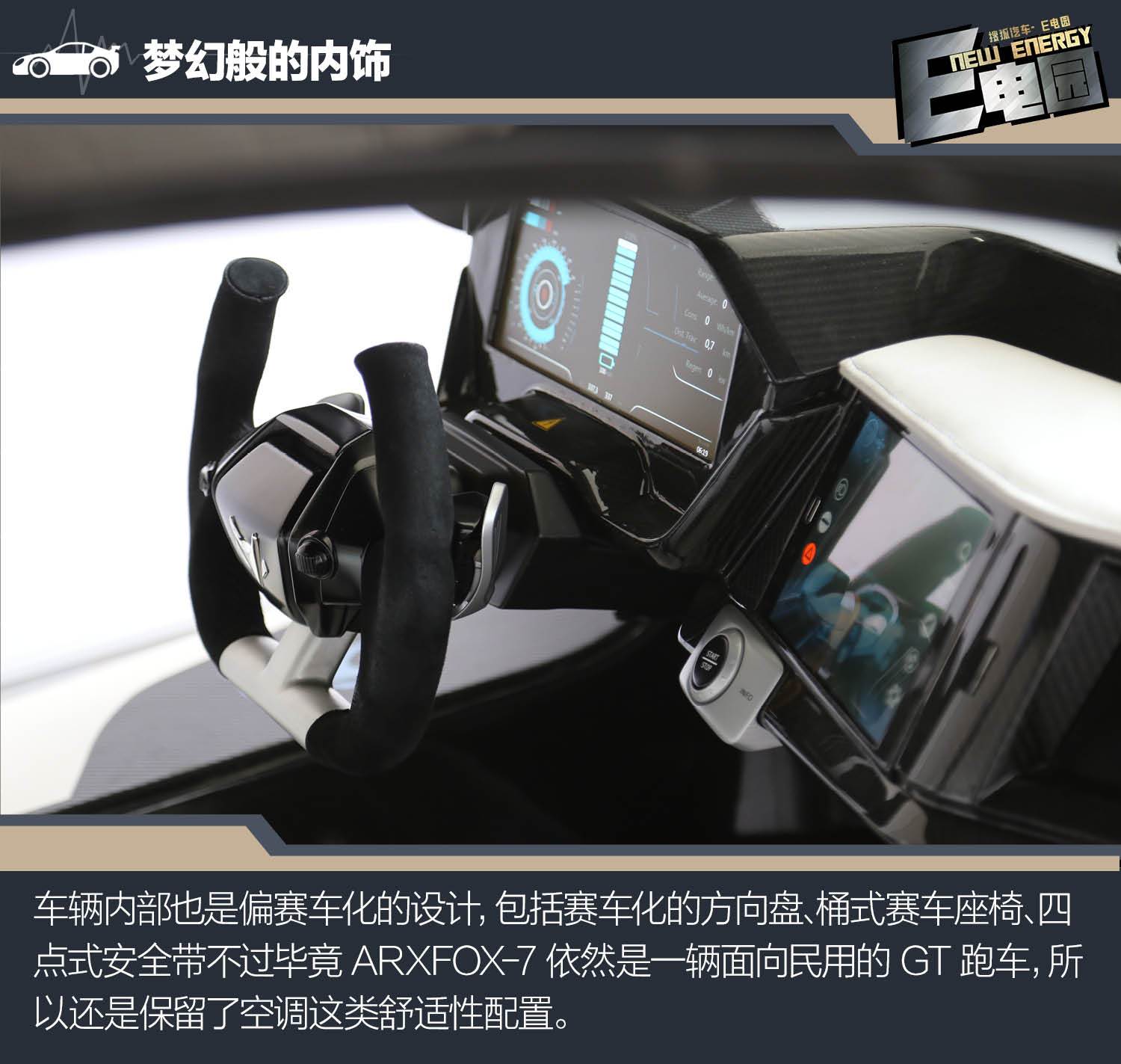從內(nèi)飾就可以看出 ARCFOX-7 采用都是炭纖維座艙,內(nèi)部也是偏賽車化的設(shè)計,包括賽車化的方向盤、桶式賽車座椅、四點式安全帶不過畢竟 ARXFOX-7 依然是一輛面向民用的 GT 跑車,所以還是保留了空調(diào)這類舒適性配置。